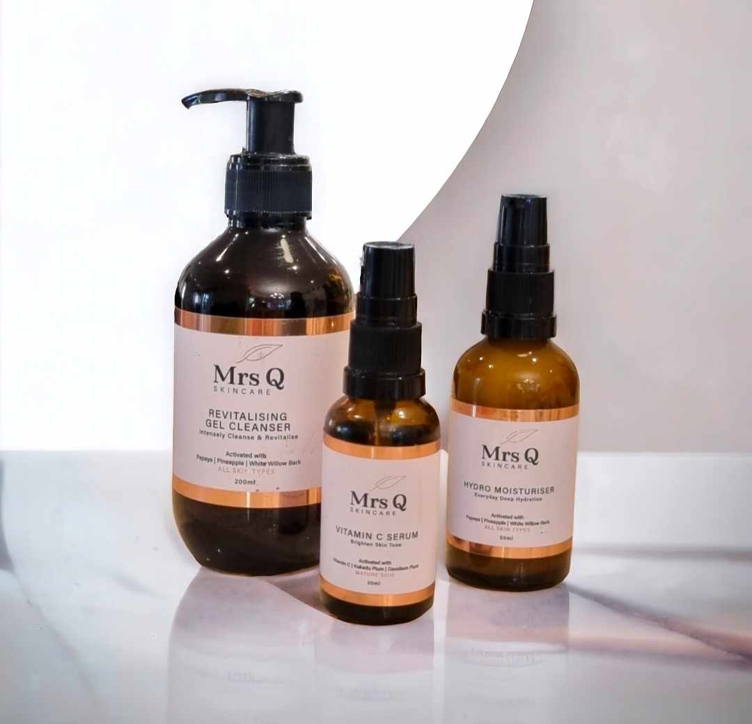 I got you covered. Mrs Q Skincare makes it easy to start and see results from the first pump of product. Starting with a fresh revitalising thorough clean morning and night. Awaken your senses or wash the day away, feel refreshed and clean without the tightness an see the glowy look of confident skin come back. Repair and refresh the skin with Vitamin C Serum, one of the most concentrated Vitamin C's out there and finish off with a deep dose of hydration with my Hydro Moisturiser. You will see and feel the difference immediately and see the power of natural, active ingredients in clever skincare.